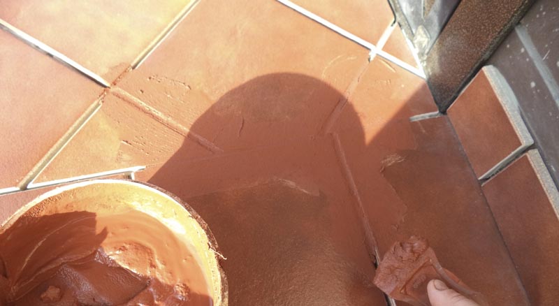 После завершения отделочных работ плиточные швы на половину глубины затираются акриловой грунтовкой, смешанной с песком, оставшееся пространство — мелким песком.
