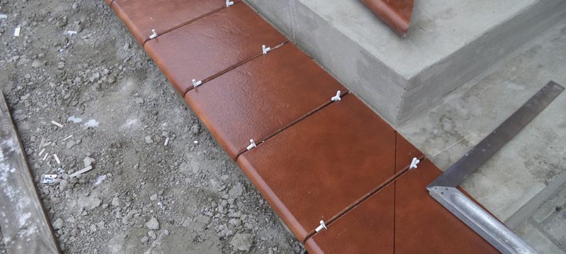 Укладка отделочной плитки выполняется по уровню торца бордюра из камня или верхнего края стального уголка. Это позволяет надежно закрепить плиточную проступь на гравийно-песчаной основе.