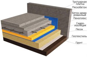Часто под песчаную подушку подкладывают геотекстильное полотно, а бетонное основание укрепляют с помощью металлического каркаса, сваренного из уголка.