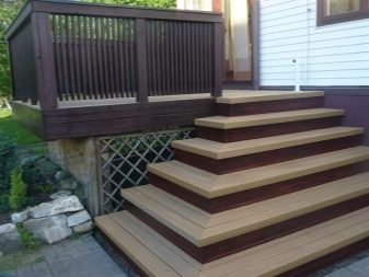 - из плотных пород древесины – гармонично сочетается с деревянным домом, но в качестве облицовки себя не оправдывает. Оптимальный вариант – устройство деревянного крыльца с лестницей, а не обшивка бетонной глыбы.