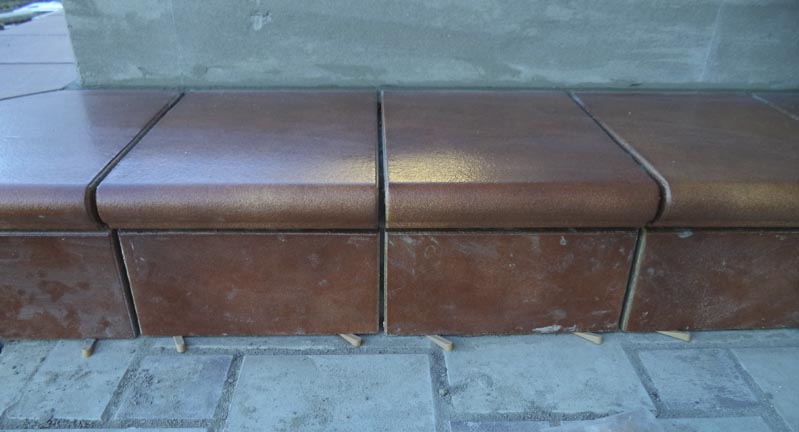 Для облицовки торцевых частей ступеней, можно использовать обрезки плиточных полотен. Общая технология их облицовки выполняется в той же последовательности – армирование, затирка клеем, затирка цементным раствором, грунтовка, облицовка плиткой.
