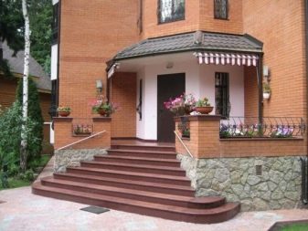 Реже встречается крыльцо сделанное из такого уникального по своим свойствам, но при этом дорогостоящего материала как древесно-полимерный композит (ДПК). Террасная доска из данного материала совмещает в себе все достоинства полимеров и древесины – она долговечная, прочная и устойчивая к гниению, не истирается, обладает антискользящей поверхностью, не деформируется при перепадах температур и влажности.
