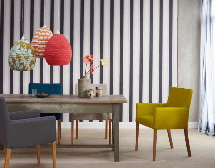 Помните! Яркие обои с полосами создадут акценты на стене, поэтому продумайте, где их лучше разместить: за кроватью, диваном, в зоне камина или обеденного стола. Нередко с помощью полос выделяют акценты на выступах и нишах.