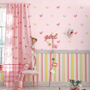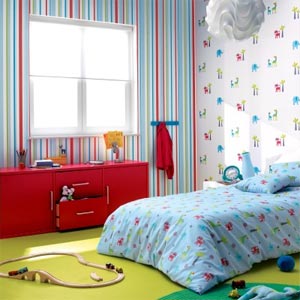 Обычно полосатые обои комбинируют с однотонными, но в детских комнатах хорошо и забавно смотрится, когда они комбинируются с обоями с рисунком.