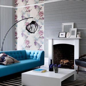 Цветы. Как ни странно, полосатые обои неплохо сочетаются с цветочным принтом и орнаментом. Поскольку в интерьере должен доминировать лишь один мотив, или цветы, или полоску следует делать более яркими и контрастными.
