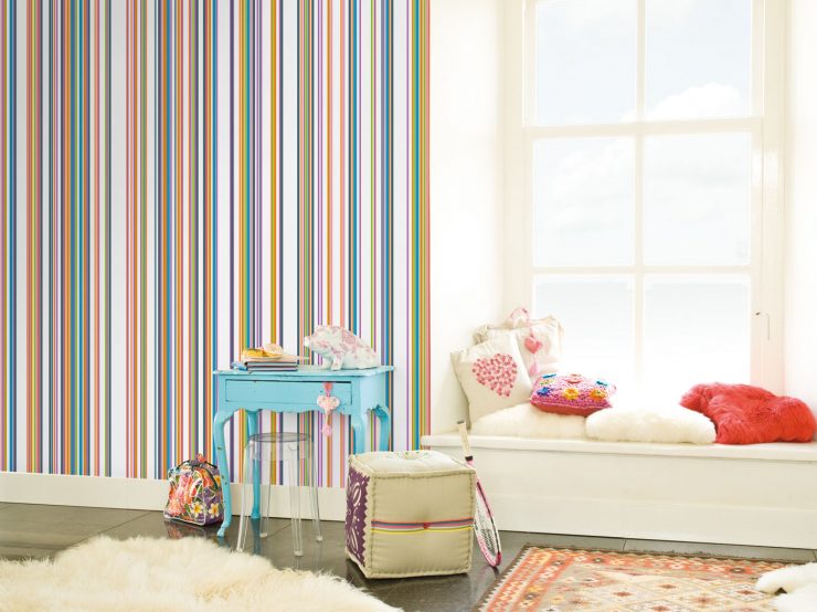 Для тех, кому разноцветная полоска кажется слишком смелой, можно посоветовать выделить яркими обоями лишь одну стену в комнате, остальные же оклеить обоями спокойных цветов. Полосатая стена должна быть центральной, она будет основным акцентом в интерьере, поэтому ей не требуется дополнительные украшения в виде картин или постеров. Также не стоит размещать возле яркой стены любые декоративные объекты – они попросту потеряются на фоне ярких полос.
