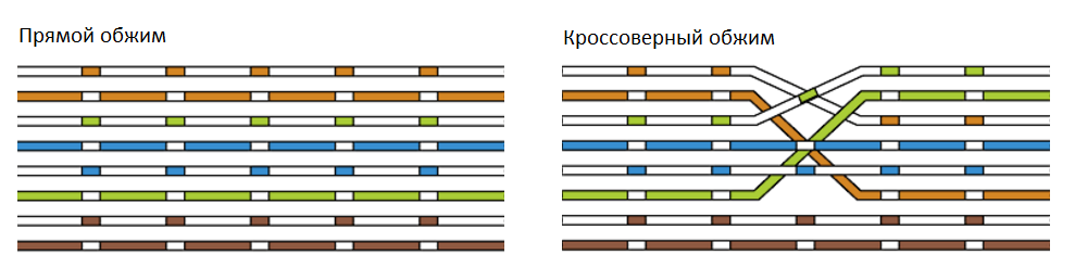 Существует две основных схемы распределения: EIA/TIA-568А и EIA/TIA-568B. В них по-разному расположены жилы. В сетевом шнуре их всего четыре пары, реже — две. Для таких проводов схема будет иная.