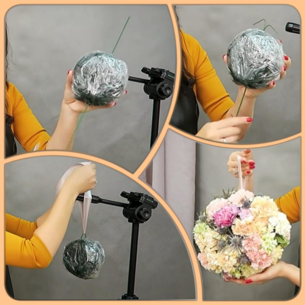 А для создания букета-шара можно взять не только магазинные цветы, но и выращенные на даче, ведь основой композиции будет флористическая губка. Схема сборки помандера предельно проста, и каждый начинающий флорист способен ее запросто выполнить.