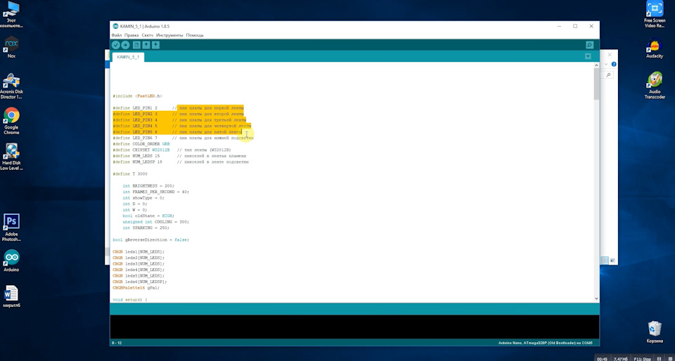 Ниже надо прописать количетво светодиодов на отрезках лент. У меня была лента на 58 светодиодов, делим на 6, в отрезки на пламя получилось по 10, а на нижнюю подсветку 8 светодиодов. После можно заливать скетч ардуинку.