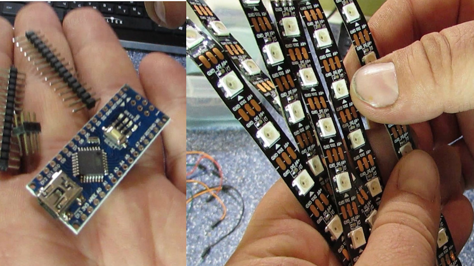 Всем привет, все мы любим Новый год и я думаю всем хочется уюта и тепла в своих кватрирах, а особенно этого хочется в эти длинные зимние рождественские вечера. Тепло нам поставляют наши доблестные комунальные службы, а вот уют и праздничную атмосферу не кто кроме нас самих для нас ни кто не создаст. Помимо традиционной новогодней атрибутики, такой как елка, гирлянды, подарки довольно популярны становятся и фальшкамины. И этот естественно, потому как, что может быть уютней настоящего домашнего очага, камина. Конечно хороший фальшкамин могут позвольть себе не многое, а настоящий так вообще только избранные, но если есть желание и хоть немного фантазии фальшкамин можно сделать самим из доступных материалов хотя бы из того же картона. Вот и мы захотели добавить чуточку уюта в свою квартиру и сделать камин. Но сам каркас камина собрать не сложно гораздо интереснее обстоят дела с самим очагом хочется, что бы он походил на настоящий огонь. Вот об этом очаге я хочу рассказать, а точнее не о всем очаге так он состоит из многих компонентов это угли, дрова и др, а об эффекте пламени.Лучший эффект живого пламени получается при подсветке водяного пара желтой галогенкой, но я так сильно заморачиватся не хотел да и тем более для картонного камина это не лучшей вариат. Я сделал из того что было, а это ардуино нано и лента на адресных светодиодах.
