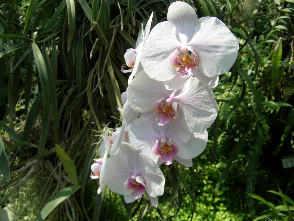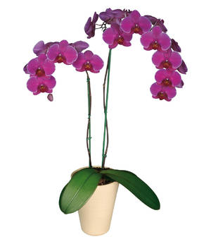 - Фаленопсис. Цветки плоские, на изогнутых цветоносах. Живут около месяца. Гибридные разновидности неприхотливы в выращивании, могут цвести периодически круглый год. Цветут при +28°C. Осенью фаленопсис следует на несколько недель поместить в прохладное место.