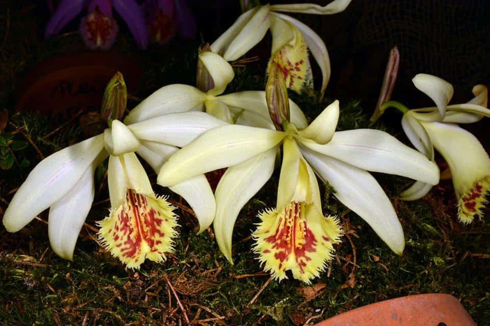 Плейоне приземистая (P. humilis) – миниатюрная орхидея с колбовидной оливково-зеленой псевдобульбой. Цветы белоснежные, лишь на губе посыпаны мелкие малиновые либо желто-шоколадные пятнышки.