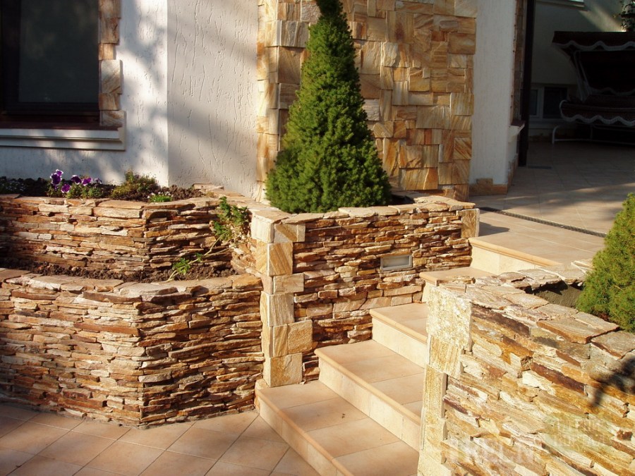 - Затем клеим керамогранит на цоколь. В нижней части цоколя можно установить профиль, на который будет опираться облицовка из искусственного камня. Укладка плитки начинается с нижнего угла. Сначала проходят первый ряд, затем остальные.