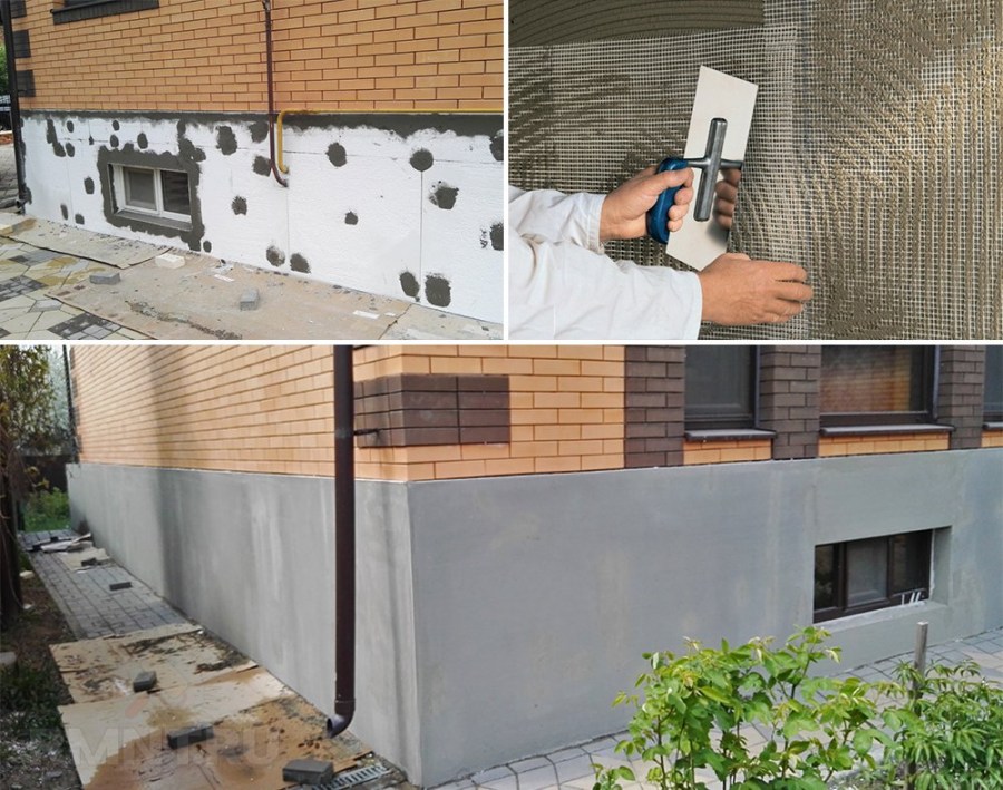 - Если вы не планировали утеплять фундамент отдельно, то перед покрытием штукатуркой все же рекомендуют уложить пенополистирольные плиты. Это не только утеплит, но и выровняет цоколь.