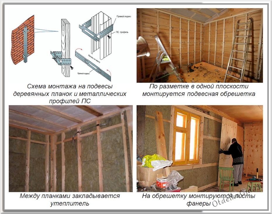 Создание каркаса является наиболее популярным решением, поскольку удается провести выравнивание оснований даже с серьезными искривлениями. Установка фанерной облицовки осуществляется преимущественно на деревянный брус. Альтернативный вариант – монтаж оцинкованных профилей, что больше подходит при работе с бетонными поверхностями в неотапливаемых помещениях.