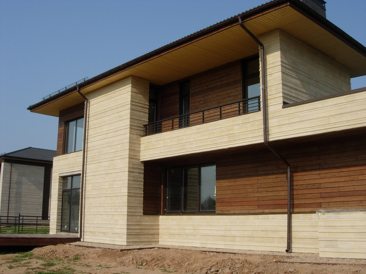 К типу деревянной облицовки относят привычные всем вагонку, сайдинг панели, планкен, блок-хаус и другие всевозможные материалы – продукты отходов деревообрабатывающего производства. Основными достоинствами такого типа обшивок считаются экологичность сырья, простота монтажа и хорошая совместимость с основной постройкой. Но, как и любой материал, облицовка из дерева наделена существенными недостатками. Главным минусом является горючесть материала. Также дерево со временем подвержено гниению и подается усадке. Спустя несколько лет фасад, отделанный деревом, темнеет и приобретает старый неряшливый вид и его приходится менять, что негативно отражается на бюджете.