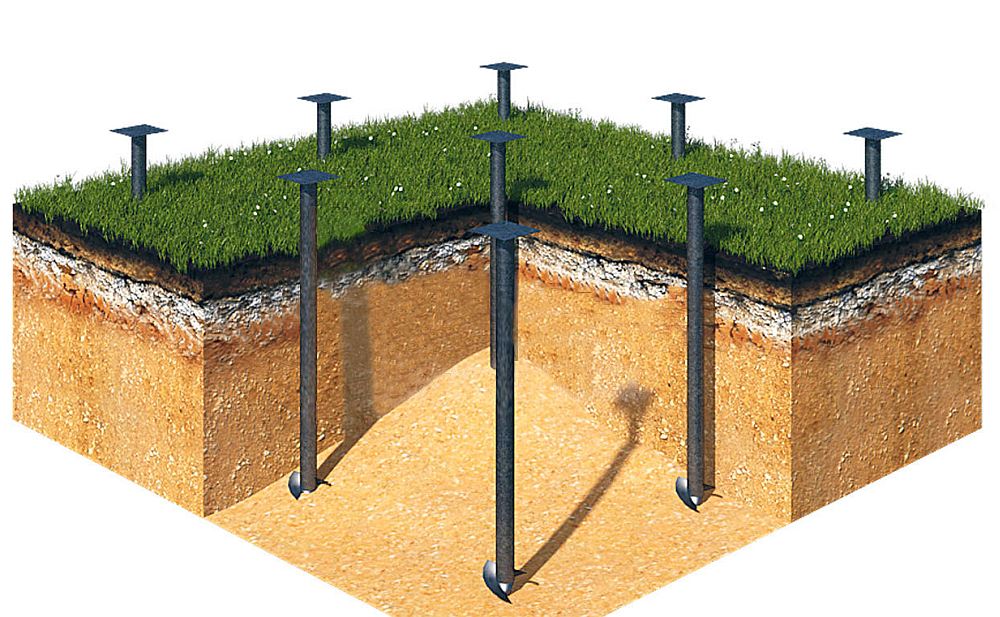 Однако более простым решением будет обустройство фундамента на сваях. Технология его возведения предусматривает вкручивание в почву свай с последующей заливкой их внутренней части бетоном. Кроме того, такой способ позволяет фундаменту «продуваться», что уберегает древесину от гниения.