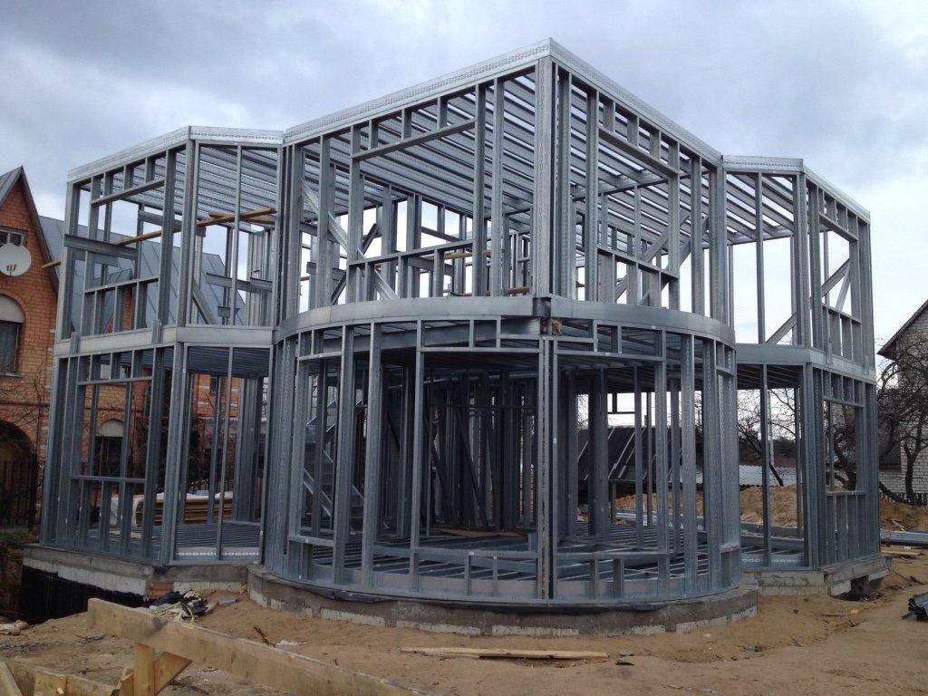 Выполняют из профилей различной конфигурации, собранных на болтах. Они должны иметь антикоррозийное покрытие (быть оцинкованными или окрашенными). Металлический каркас позволяет устраивать большие пролеты перекрытий и проемы в стенах (в этом с ним может сравниться только каркас из клееного бруса).