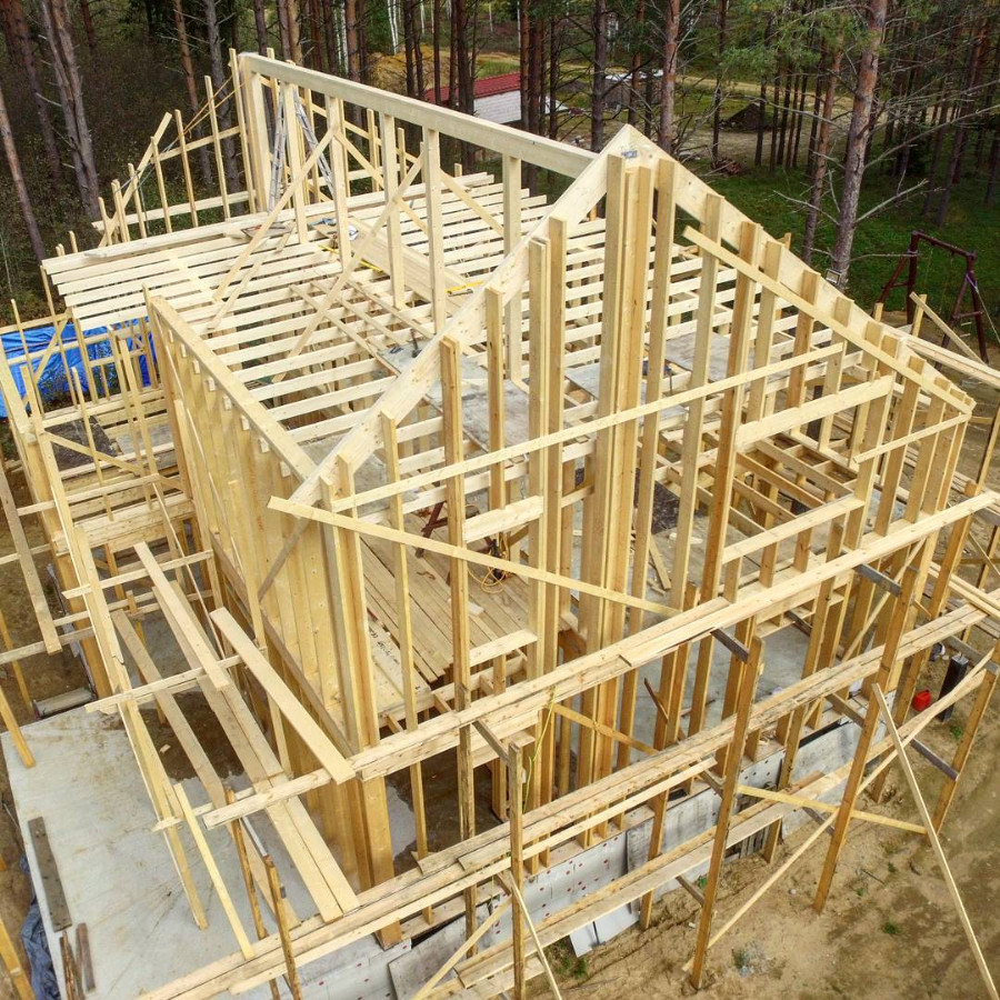 Делают из доски, цельного или клееного бруса (который является самым прочным, качественным и дорогим), а также деревянной двутавровой балки (дерево + ОСП + дерево). Стандартное сечение стойки — 50 х 150 мм. От качества дерева зависит долговечность и прочность дома. Главное требование — влажность пиломатериалов должна быть не выше 18%. Дома с деревянным каркасом наиболее распространены.