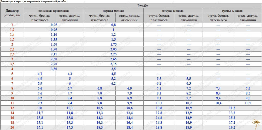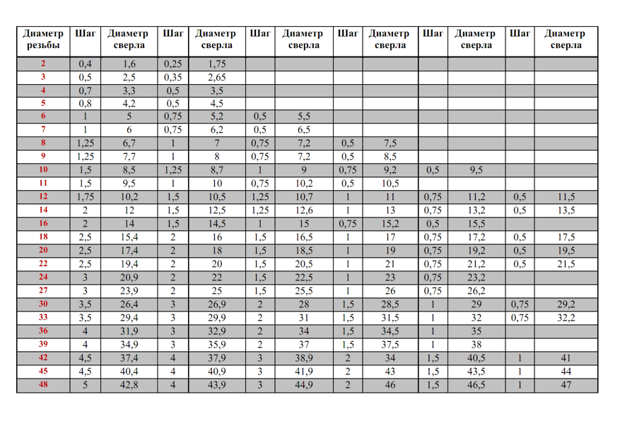 Несмотря на то что метрическая система исчислений является наиболее популярной, рекомендуем ознакомиться с таблицей диаметров сверл под резьбу: