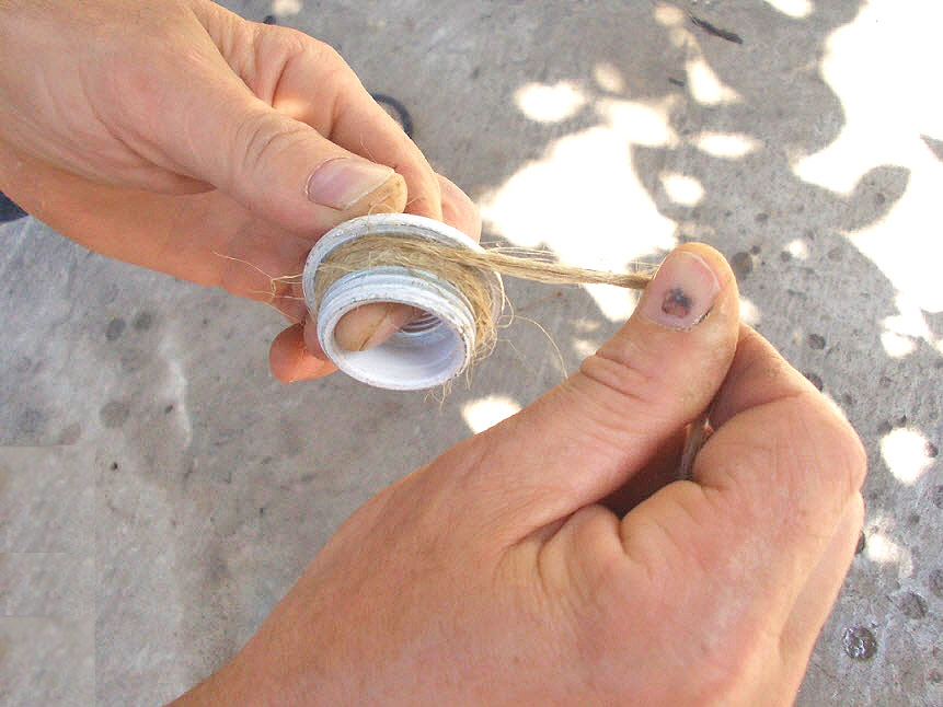 Разделенную по волокнам паклю, не допуская, перегибов кладут в бороздки между резьбой, и наносят герметик.