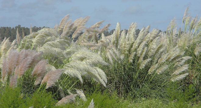 Пампасная трава – особенности посадки, ухода, зимовки Кортадерия, или пампасная трава, на дачном участке смотрится великолепно. Но выращивают ее почему-то не многие. Давайте познакомимся поближе с этим мощным и в то же время изящным растением. Пампасная трава – многолетнее растение из семейства Злаковые, которое способно образовывать крупные и густые дернины до 3 м в высоту и ширину. В дикой природе она произрастает в пампасах Южной Америки и считается сорняком. Вытянутые заостренные листья растения свисают под тяжестью собственного веса и тем самым придают кусту округлый вид. Цветет пампасная трава с августа до самых морозов разветвленными цветочными метелками серебристой, розовой или желтой окраски