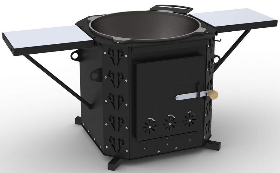 - Металлическая печь казан с мангалом. Приварив мангал к печи, экономится металл, необходимый для изготовления 1 боковинки. Экономится место на участке или в беседке. Можно попросту сделать вырезы – сегменты для вращения шампуров и использовать печь как мангал.