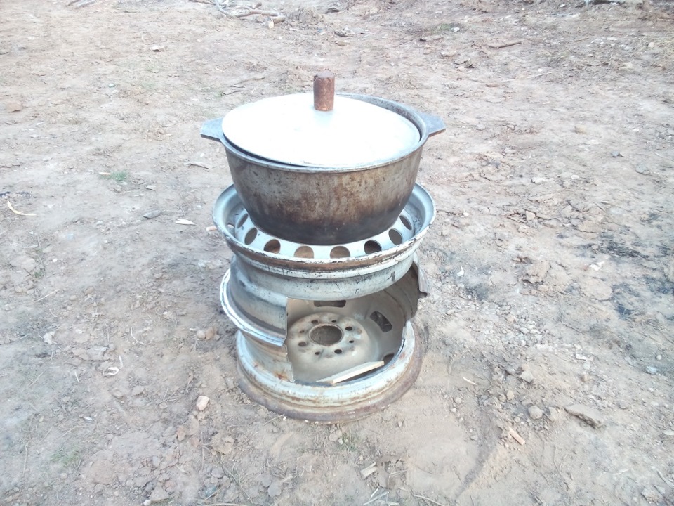 Печь состоит из нескольких колесных дисков сваренных вместе. Если казан небольшой, можно его устанавливать на лицевую сторону диска. Для этого детали выкладываются навстречу тыльными сторонами. Для установки средней посуды вырезается место с крепежными отверстиями для колеса.
