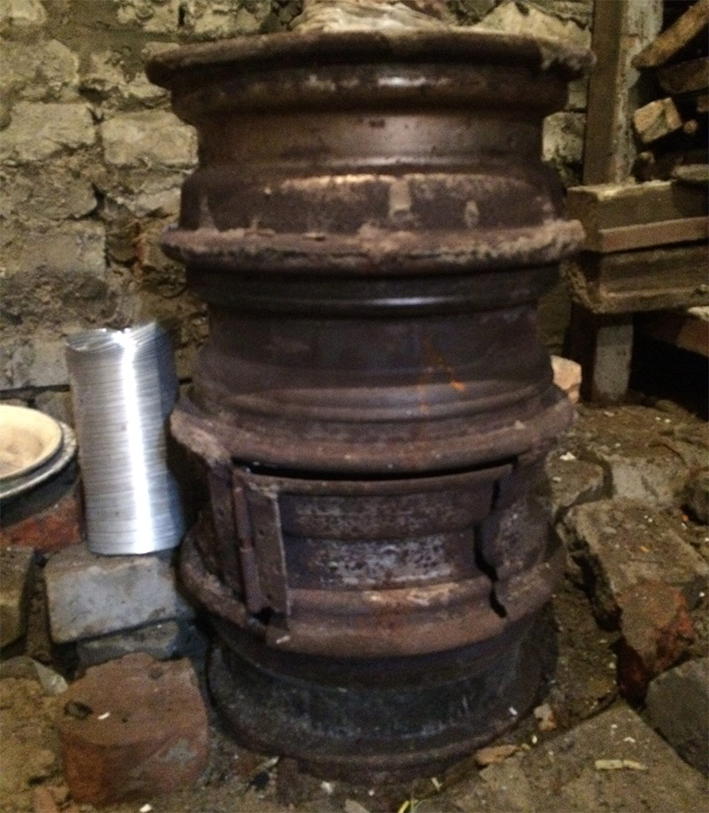 Хорошие печи-буржуйки получаются при горизонтальном расположении колесных дисков. Их выпуклые части лучше срезать болгаркой. Сваренные между собой секции образуют вместительную толстостенную полость со сложной поверхностью. Такая буржуйка будет быстрее нагревать помещение и дольше остывать. Для изготовления подобной печи лучше использовать колесные диски от грузовых автомобилей, они обеспечат достаточный объем топки и увеличат теплоотдачу. КПД таких устройств выше.