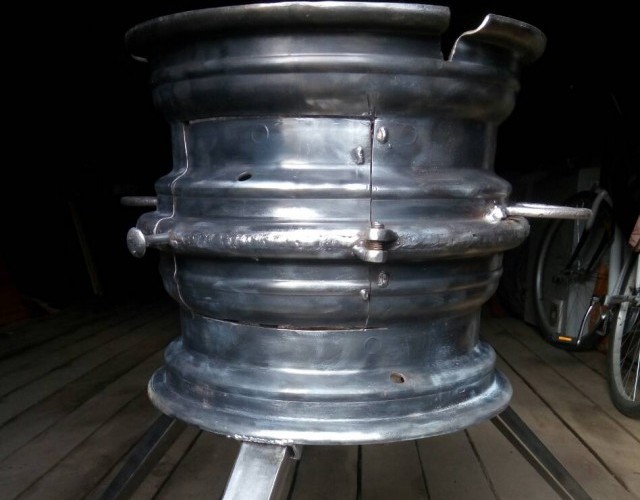Это очень удобно при выезде на пикник, где каждый сможет получить пищу по своему вкусу. Печку такого типа принято изготовлять из дисков с небольшим количеством технологических отверстий. В качестве деталей для рабочей решетки используются велосипедные спицы. Варить их необязательно, т. к. они отлично фиксируются друг с другом и с помощью жаростойкого клея по металлу (метод холодной сварки).