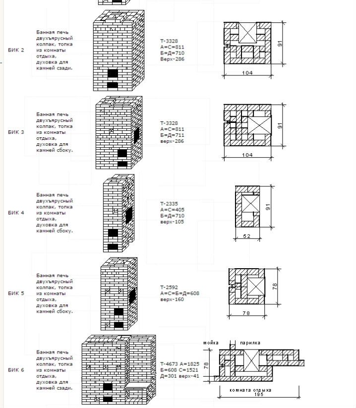 В разделе печей для бани Кузнецов предлагает сразу вариант планировки помещений с указанием габаритов и показано как можно «вписать» туда подходящие модели. Ведь помещения бань, как правило, небольшие и если металлическую печь разместить в ней можно легко, то габаритную кирпичную уже проблематично. И учитывать при этом нужно многие факторы: откуда топиться будет, где выход пара и самая горячая часть печи. А тут предложены готовые варианты. Очень удобно и стоит сказать автору большое спасибо! Сами печи вынесены в отдельную категорию и маркируются БИК.