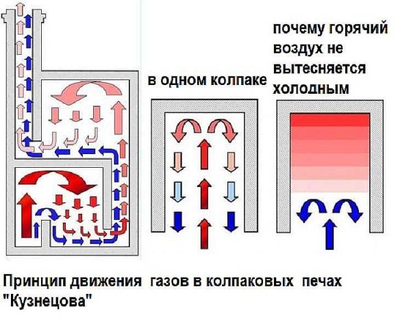 Кузнецов использует другой, принцип движения газов в печи — свободный. Печь состоит из колпаков — перевернутых вверх дном сосудов (с отверстием вверху или без — по-разному в разных моделях). Колпаки могут располагаться друг над другом или один за другим, но обязательно сообщаются между собой при помощи сухого шва — пространства в 2-3 см, незаполненного раствором или теплоизолятором, через который и переходят газы из одного колпака в другой.