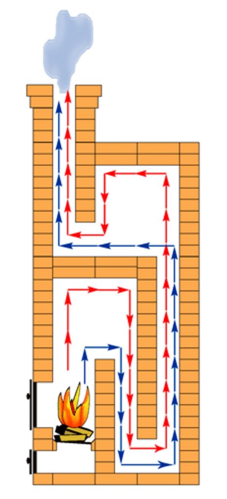 В канальной печи горячий воздух движется по направлению от топки в сторону дымохода. При этом нагреваются стенки конструкции, от которых тепло излучается в помещения. В таких нагревательных дровяных конструкциях продукты сгорания удаляются естественным образом. Чем лучше тяга, тем быстрее горячий воздух отводится на улицу. КПД устройства достигает не более 60%. До 40% тепла «отапливает» окружающее пространство.
