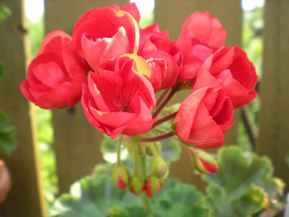 Красный колер розоподобных цветков, листочки светло-зеленые. Куст этого сорта компактный, с частыми междоузлиями.
