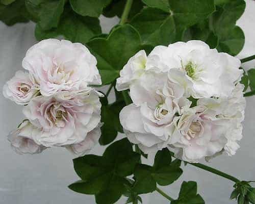 Ветвится, имеет темно-зеленые листья и белоснежные, розоватые цветки. Махровость и большой размер соцветий отличают этот сорт.