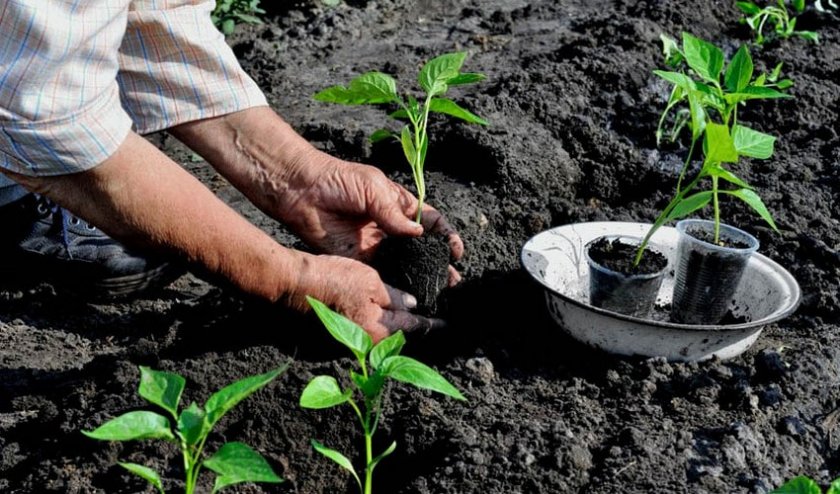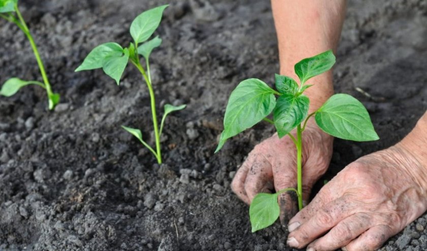 Ряды перца должны находиться на расстоянии не менее 50 см друг от друга. Ширина лунок и расстояние между ними — 8 см и 40 см соответственно. Выкапывая лунки, нужно учитывать размер корневища, а при высаживании следить за тем, чтобы шейка находилась на уровне земли. Рекомендуется добавить немного фосфора, азота и калия в каждую лунку.