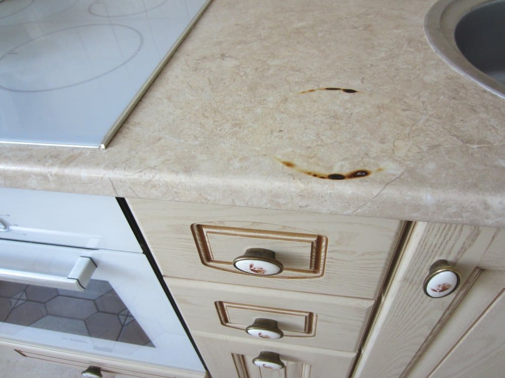 Наглядное подтверждение того, что горячую посуду с плиты нельзя сразу переставлять на ламинированную поверхность