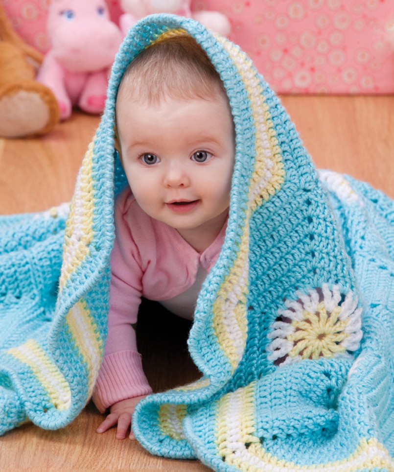 - Вязаный плед понадобится, чтобы прикрыть коляску во время вечерней прогулки с ребенком. Им можно накрыть малыша, когда он спит в кроватке.