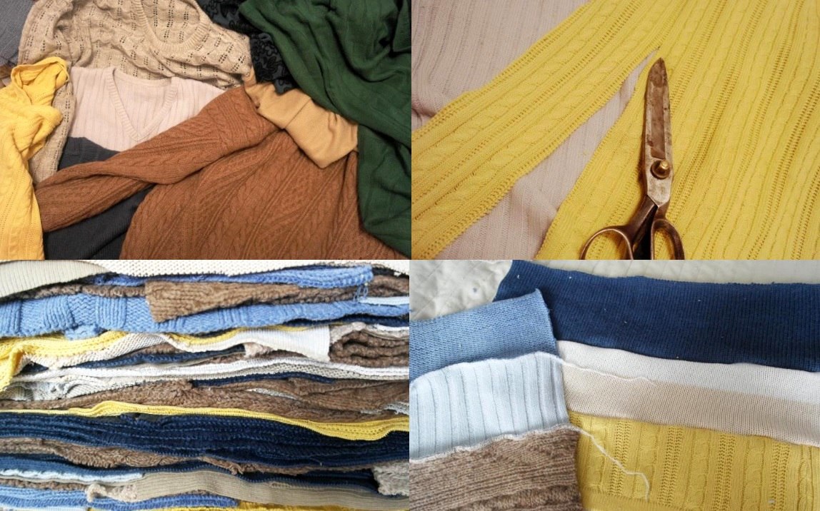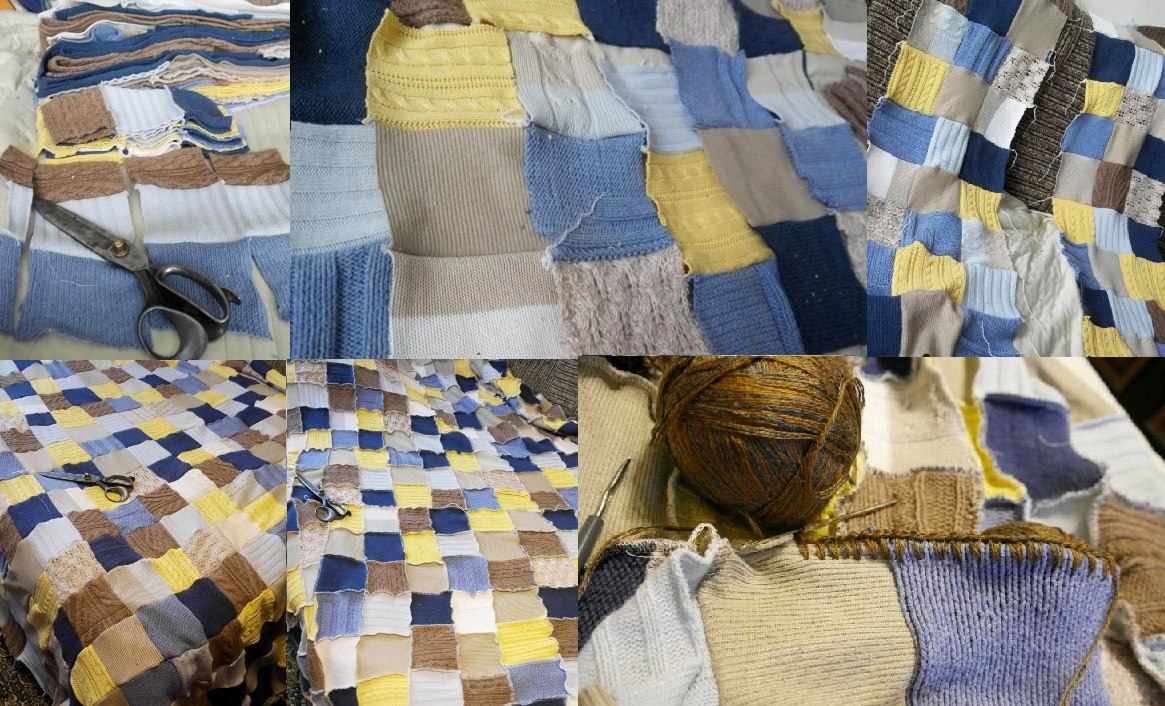 Чтобы изготовить плед из старых свитеров, понадобятся около 10 старых свитеров, однотонная ткань для обратной стороны, ножницы, стиральная и швейная машина, пряжа.