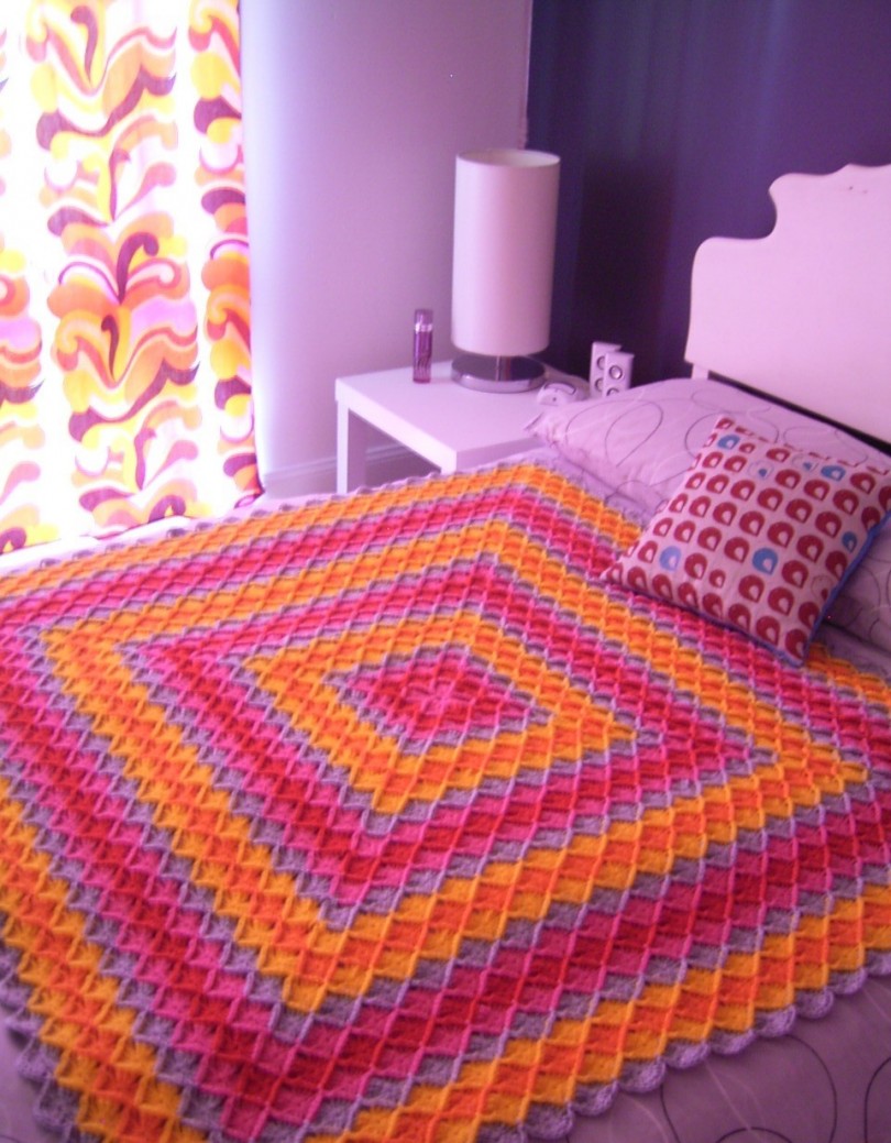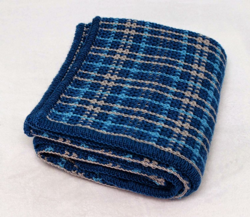 Плед вяжется постепенно, отдельные детали не требуют сшивания. В результате у вас получается двухстороннее полотно. Каждая полоса может быть связана из другой пряжи, что позволяет использовать остатки пряжи