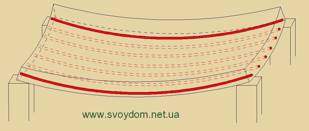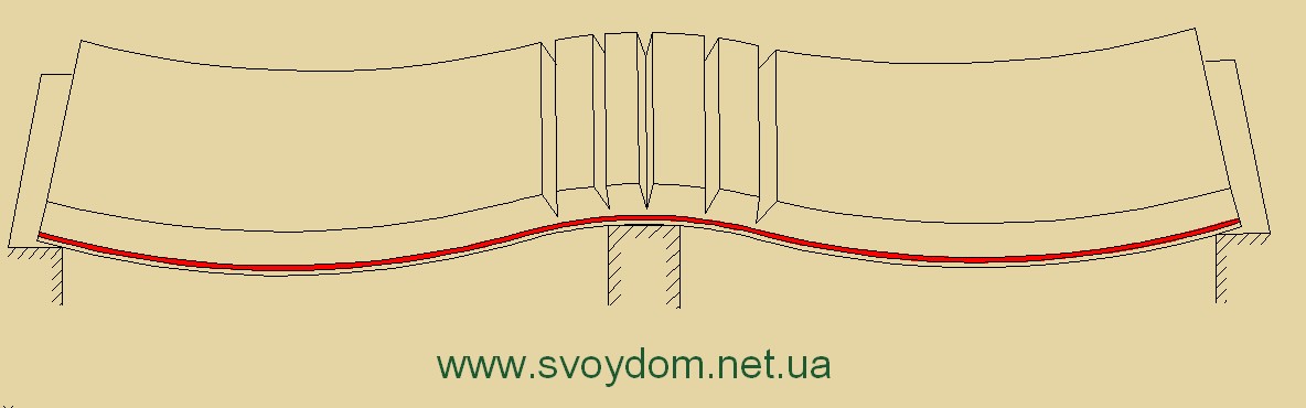 Как мы помним, рабочая арматура в плите есть только в продольном направлении. В поперечном направлении есть только незначительная сетка, которая может воспринять нагрузку от собственного веса плиты на периоде монтажа (когда петля поднимается краном за четыре петли). И если мы обопрем плиту по двум длинным сторонам, под нагрузкой она начнет изгибаться как на рисунке, и просто не будет достаточной площади арматуры в этом направлении – плита начнет трещать. На начальном этапе нагрузку сможет воспринять имеющаяся сетка, но (повторюсь), площадь арматуры этой сетки рассчитан только на собственный вес плиты.