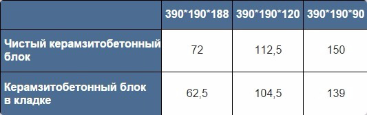 Параметры и вес различных керамзитоблоков (примеры)