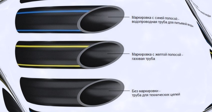 | Цветовое исполнение | Черный цвет. На трубах по боковой поверхности наносится яркая продольная полоса: желтая — на трубах для транспортировки газа, синяя — для воды. |