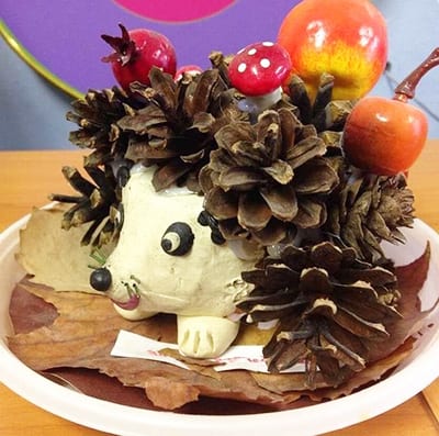 Самой популярной осенней поделкой является ежик с дарами осени — яблочками и грибами на колючей спинке. Мордочку и лапки ежика можно сделать из пластилина, а иголками будут служить колючие шишки. В качестве основы можно взять дно от пластиковой бутылки или картонный рулон.