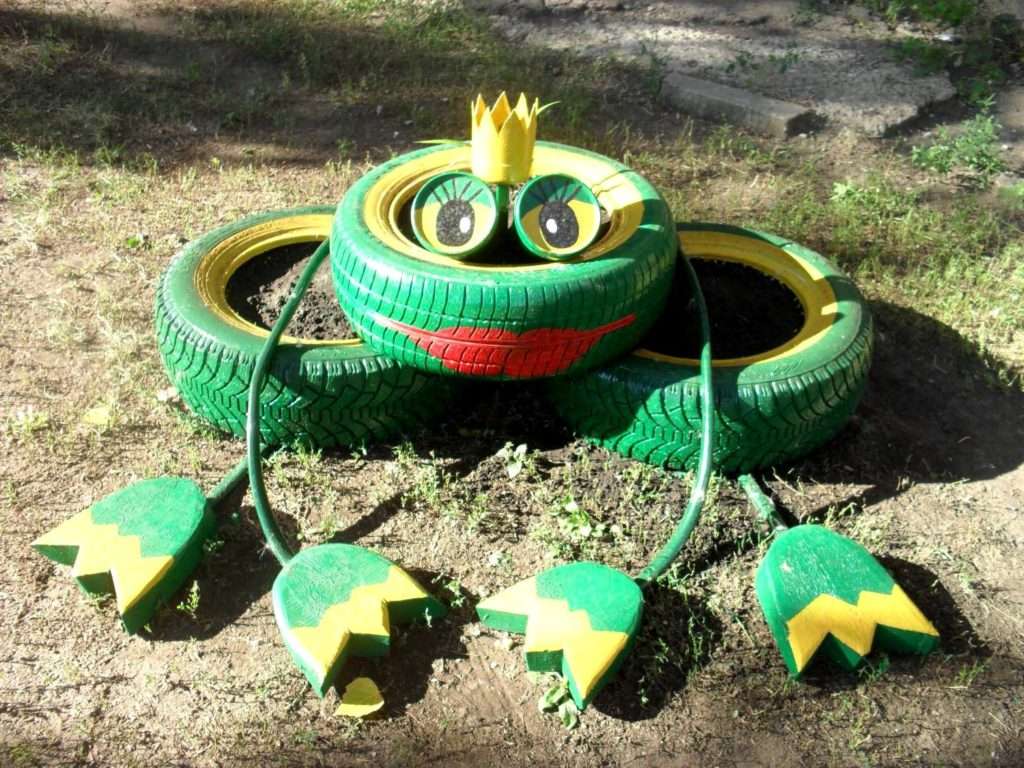 Поделки для сада могут быть и немного сложнее в изготовлении. К примеру, из тех же автомобильных шин можно сделать настоящие скульптуры и многие другие полезные поделки для сада. Проще всего вырезать из покрышки крокодила: возьмите нож и болгарку, и вырежьте туловище скульптуры по верху шины, потом на боковинах нарисуйте лапы, а глаза сделайте из крышек пластиковых бутылок. Пасть тоже вырезайте болгаркой. Легко делаются таким же образом и лягушки, ящерицы, лебеди, и черепахи. Внутри скульптур можно садить цветы или украшать ими большие клумбы.