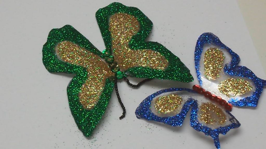 - В серединку фигурки приклеиваем пайетки или стразы, имитируя тельце бабочки.