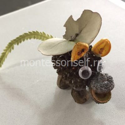 Из шишек и других природных материалов получается загадочная зверушка с крылышками.