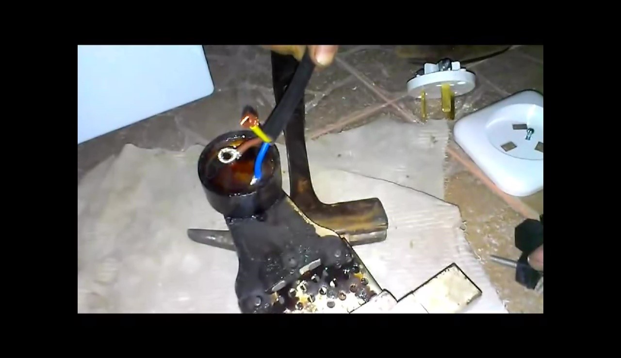 Затем подготовленные к монтажу жилы сетевого и розеточного кабелей лудят. С этой целью в небольшой емкости нагревают припой с невысокой температурой плавления (порядка 150 градусов по Цельсию). После расплавления в припой кладут кусочек канифоли. Как только она разойдется по поверхности, опускают жилу.