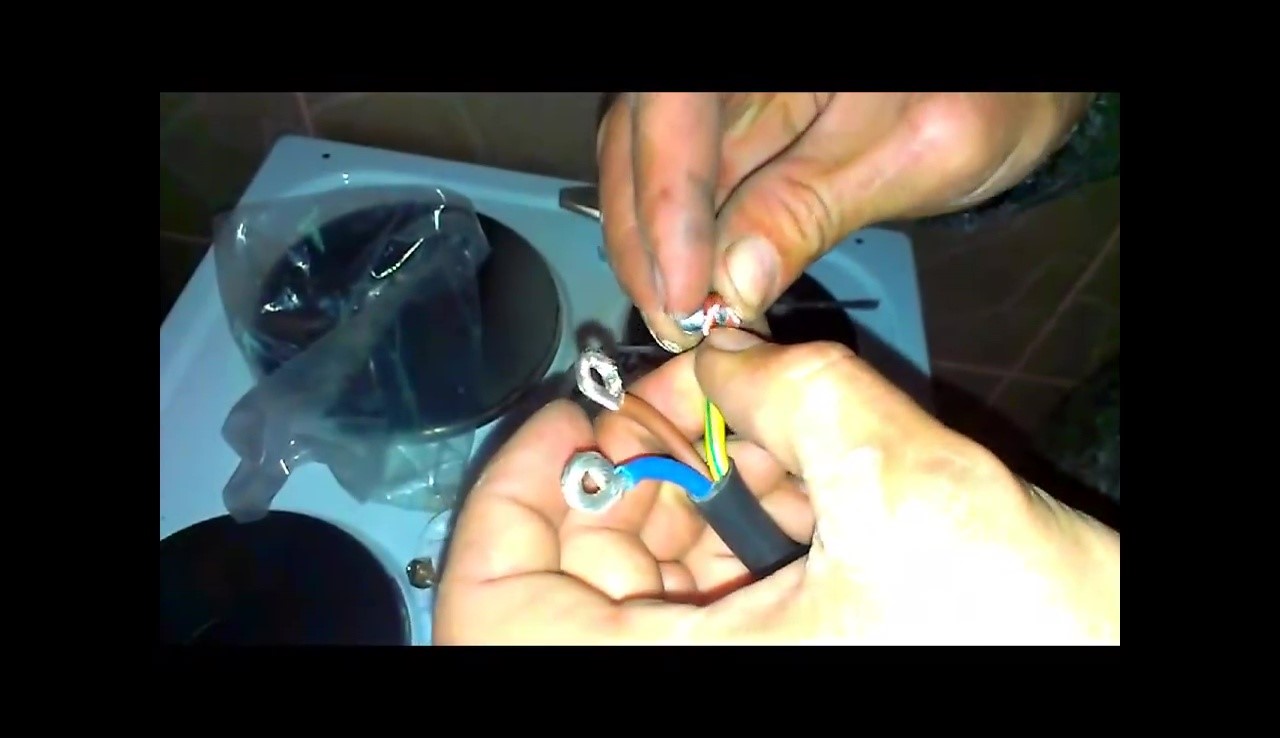 Кабель сначала соединяют с плитой. Надежнее всего предварительно обжать контактными пластинками проводники.