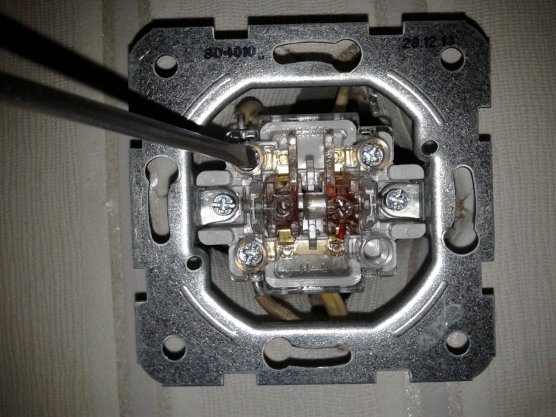 Ослабить крепления, отсоединить провода.. По окончании манипуляций на руках остается внутренность демонтированного выключателя